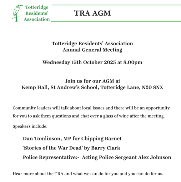 The main strength of our Association is in its membership numbers – the more members we have within our TRA, the greater our ability to deal with the issues which affect Totteridge.